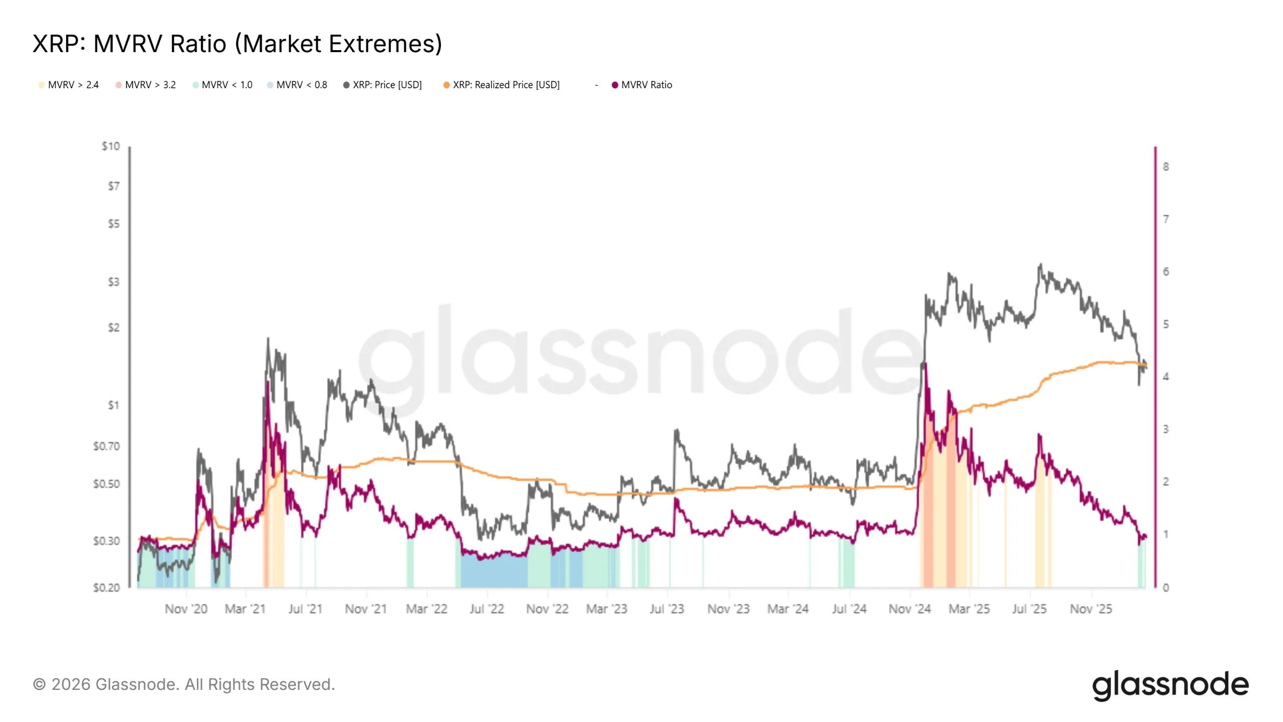 Green bars on the MVRV model show that $XRP is “getting low.” The asset has spent several days under the 1.0 threshold. Historical patterns show that a reversal often occurs when this level persists for about 15% of trading days.