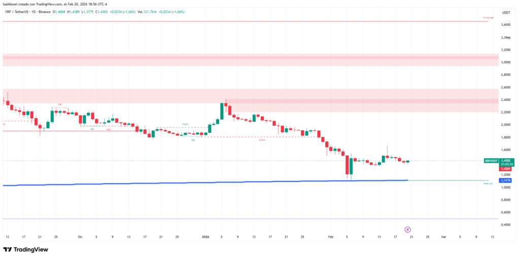 The $XRP market faces a technical dichotomy: macro indicators support a long-term uptrend, while the price undergoes a deep correction exceeding 40% from January highs. $XRP currently trades in the range of $1.39 to $1.43, far from the $2.40 reached weeks ago. The question among investors and analysts is whether the global bullish structure remains intact or if the asset entered a prolonged bearish phase.