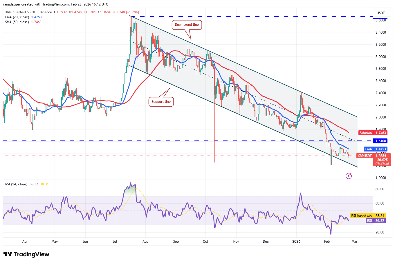 The downsloping 20-day EMA and the RSI in the negative territory indicate that the bears remain in control. If the support line cracks, the XRP/USDT pair may retest the Feb. 6 low of $1.11. A break and close below the $1.11 level may extend the decline to psychological support at $1.