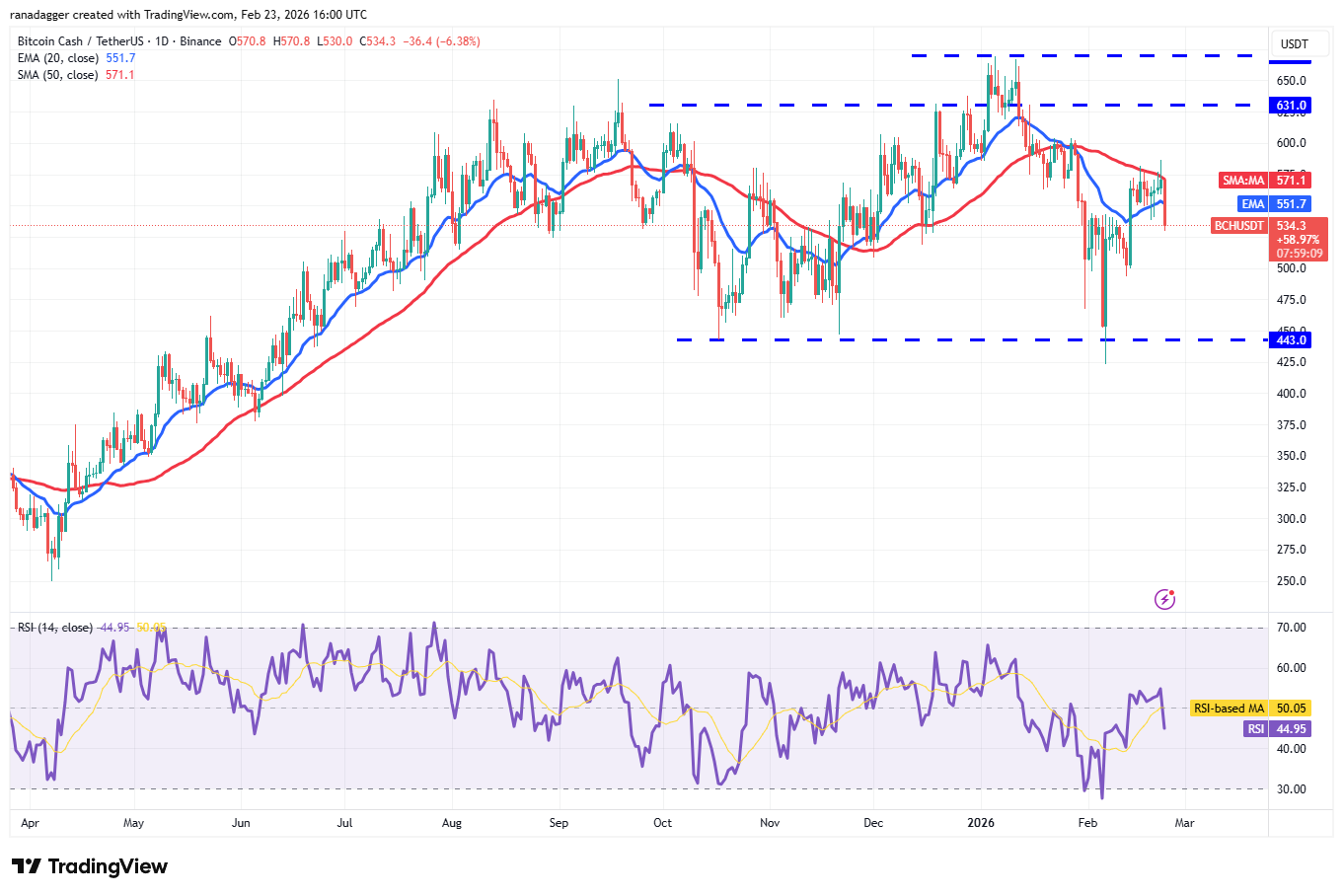 Buyers pushed Bitcoin Cash (BCH) above the 50-day SMA ($571) on Sunday but could not sustain the higher levels.