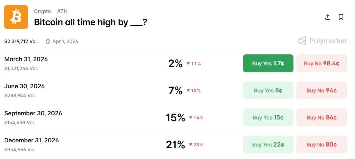 Specifically, while there is a trade with a volume of $2.3 million that is titled ‘Bitcoin all time high by ___?,’ with all the possible dates falling within 2026, the likelihood of it being resolved ‘yes’ with an actually new all-time high ($ATH) is rather low.
