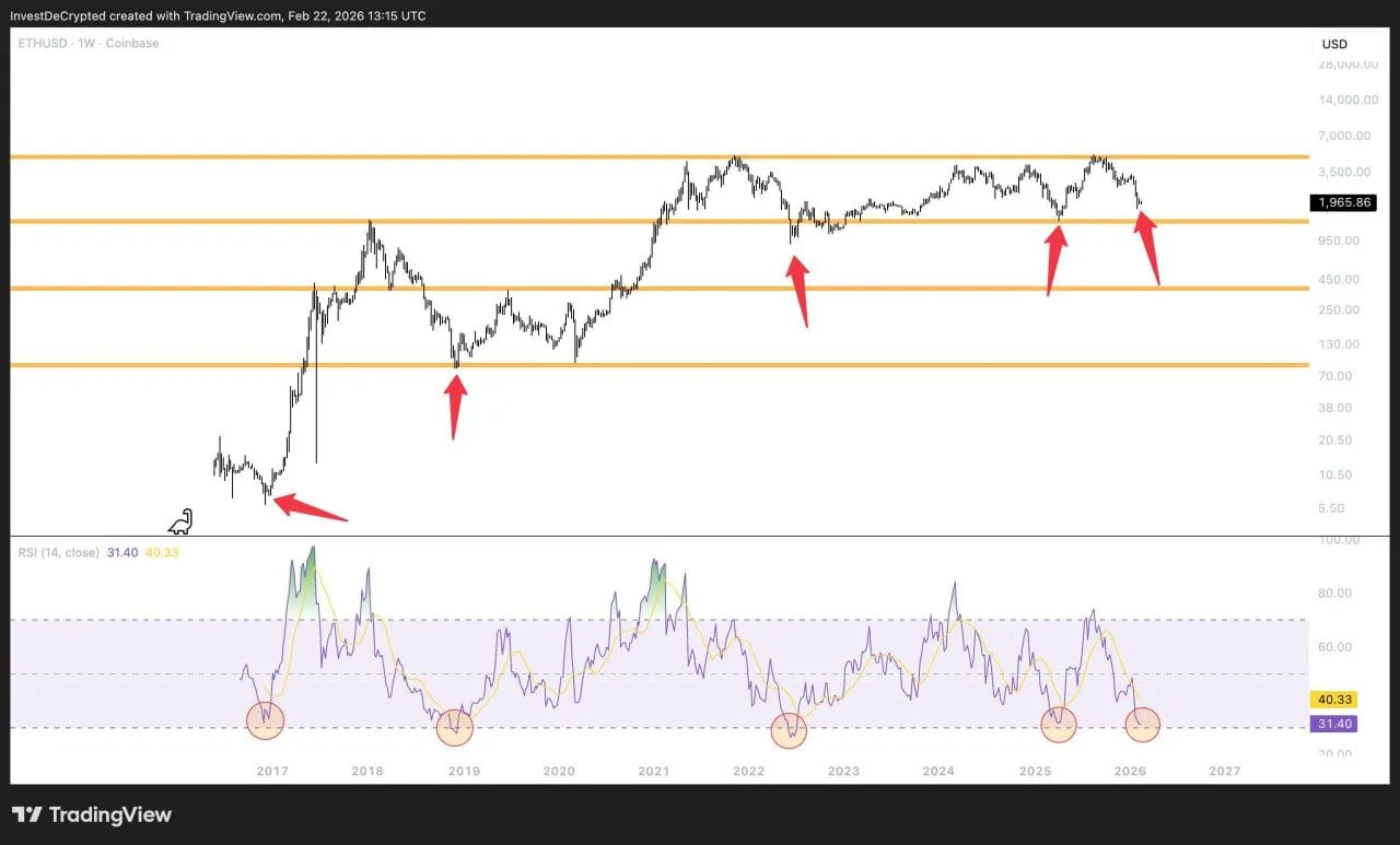 Weekly RSI hits rare low as Ethereum revisits long range support
